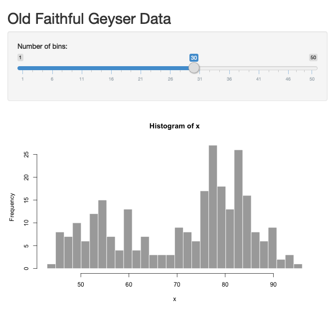 전체 소스코드를 실행하면 아래와 같은 이미지 형태의 그래프가 나오면 이제 여러분들도 Shiny App을 만든 것이다.