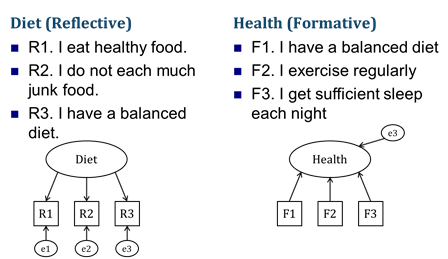 - 형성적 지표: (느슨한 적용). 잠재변수와 측정변수들의 신뢰도와 타당도는 비교적 중요하지 않음