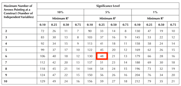 Cohen(1992)이 통계적 검증력(statistical power)를80%로 가정하고,PLS-SEM을 적용하는 데 있어서 필요한 최소표본크기 결정기준으로 제시한 것. - 만약 독립변수의 수가 6개이고, 유의수준 5%, 통계적 검증력 80%, 그리고 적어도 0.25의 $R^2$을 찾기 위한 최소표본크기는 48개임을 확인할 수 있다.